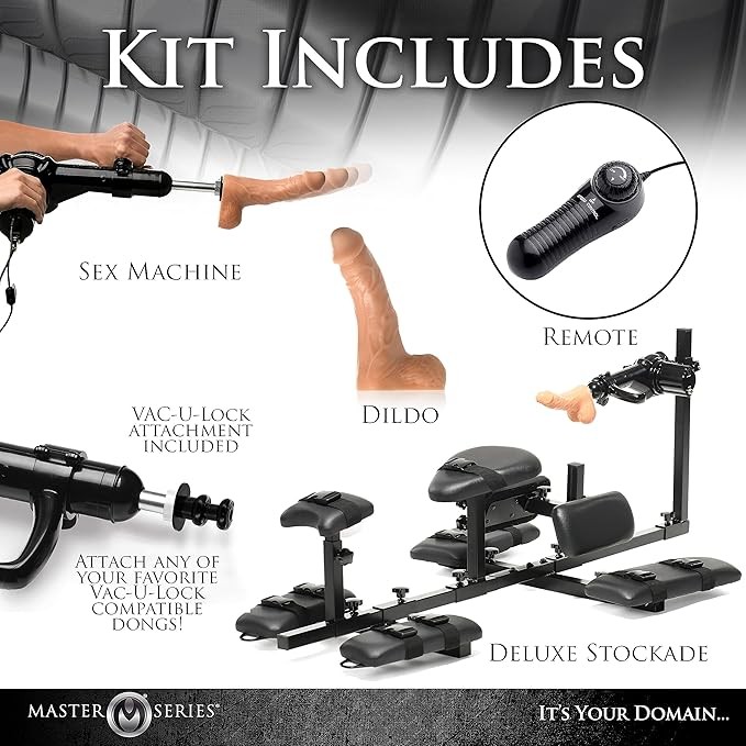 MASTER SERIES Subversion Deluxe Stockade with Sex Machine for Men, Women, & Couples. Durable Steel Frame, Padded Comfort, Multi-Speed Sex Machine. BDSM Furniture. 7 Piece Set, Black.