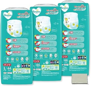 Pampers Pants, Large, Smooth Care (9 - 14 kg), 132 Sheets (44 Sheets x 3 Packs), Includes Original Tissue Diapers, Bulk Purchase