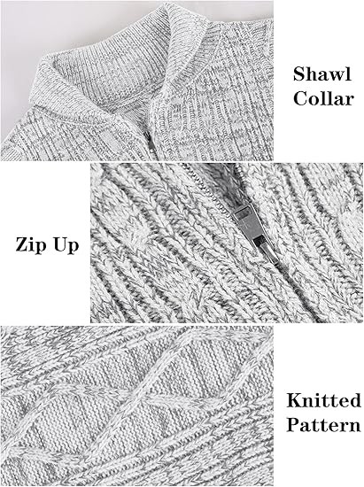 Ryannology Mens Shawl Neck Cardigan Sweater Cable Knit Zip Up Closure with Pockets Winter Sweaters Outerwear