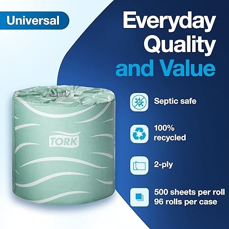 Tork Septic Safe Toilet Paper White, 100% Recycled, 2-ply, 500 Sheets per Roll, 96 Rolls